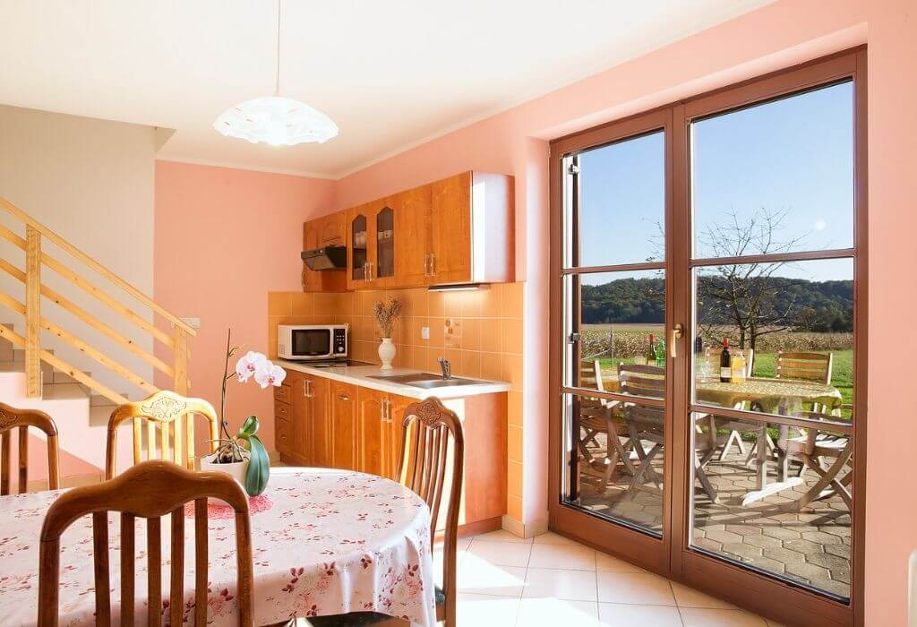 Apartma s pogledom na okoliške travnike, igrišče in jezerce je primeren za družine in prijateljska druženja, tudi v večjem številu, saj je možno druženje na pokriti terasi s skupino v sosednjem apartmaju.